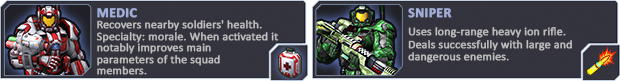 Medic – Recovers nearby soldiers’ health. Specialty: morale. When activated it notably improves main parameters of the squad members.