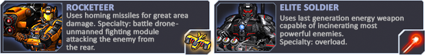 Rocketeer – Uses homing missiles for great area damage. Specialty: battle drone – unmanned fighting module attacking the enemy from the rear.